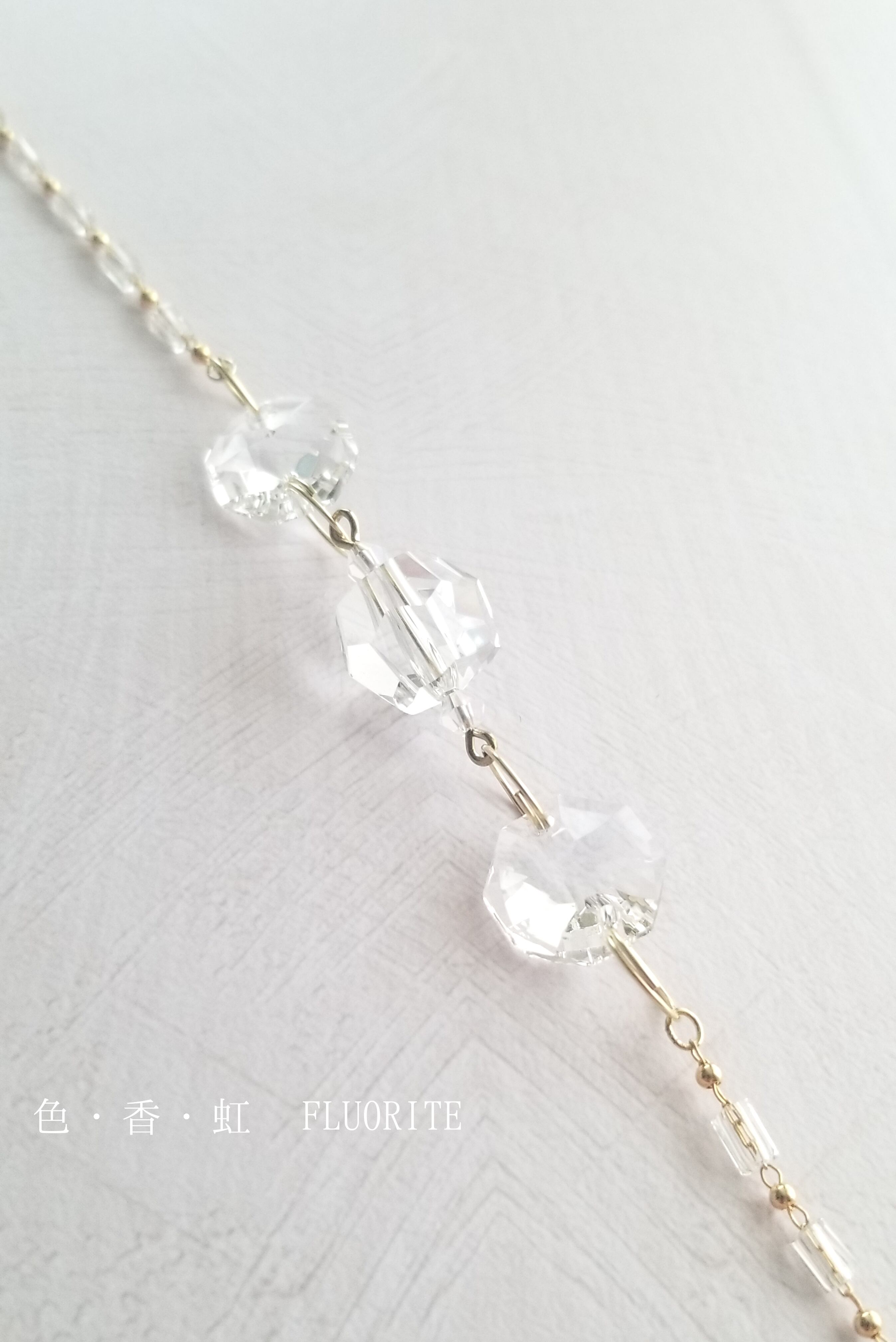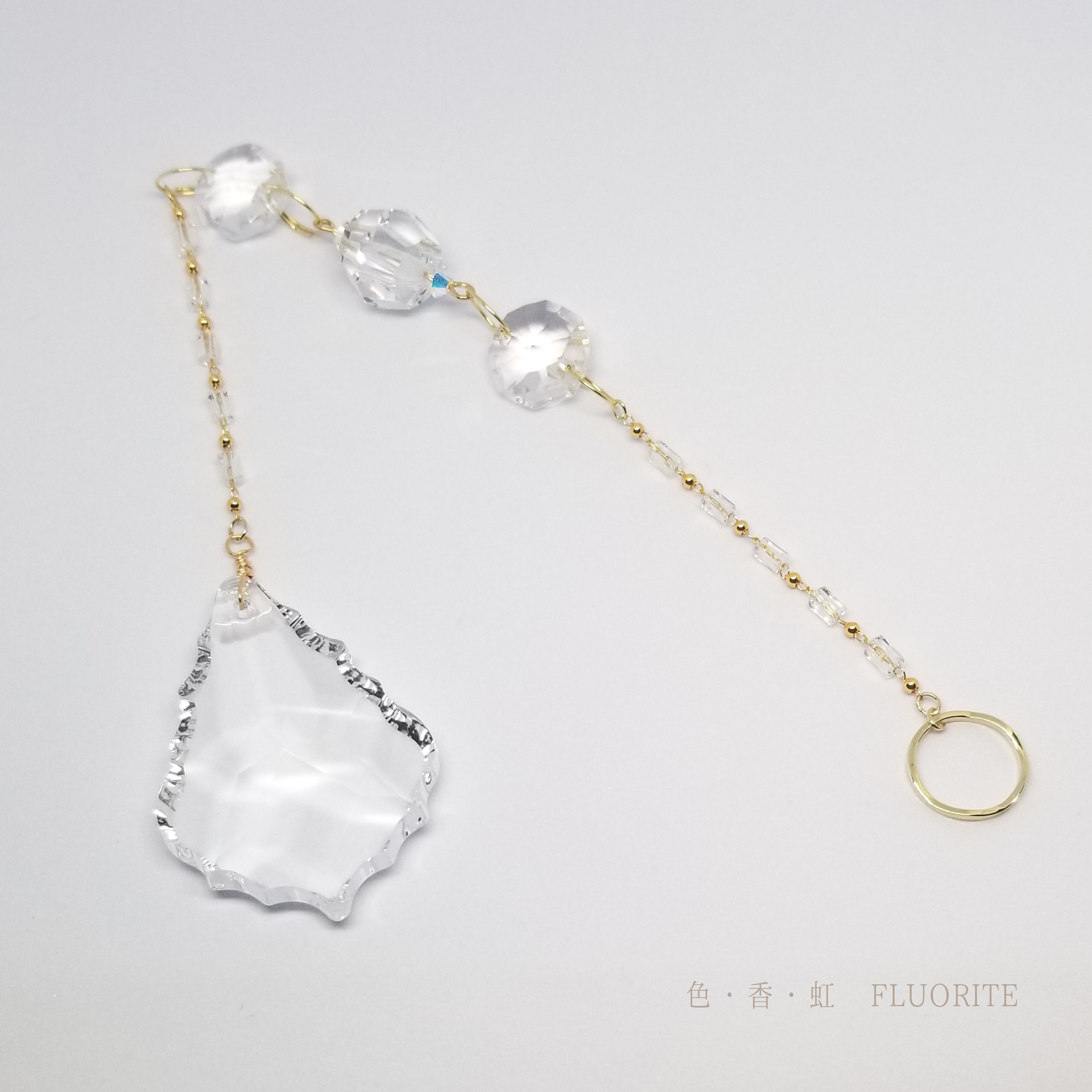 チェーン中央に配置したものも全てクリスタルガラスですので、一番下のペンデローク型クリスタルガラスと共にキラキラ感やそこから作り出される虹を楽しんでいただけます。